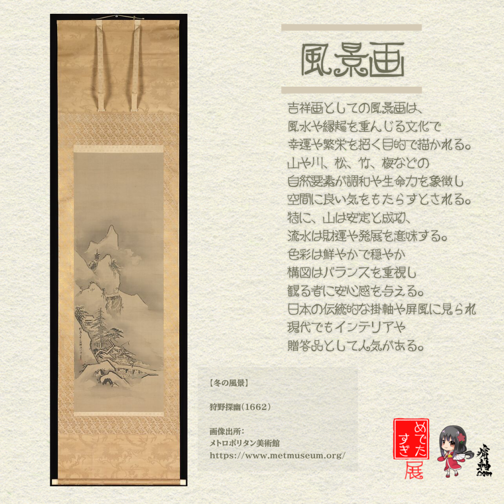 吉祥画は、縁起の良いモチーフを描き、繁栄、長寿、幸福、成功などを象徴する日本や東アジアの伝統的な絵画ジャンルです。