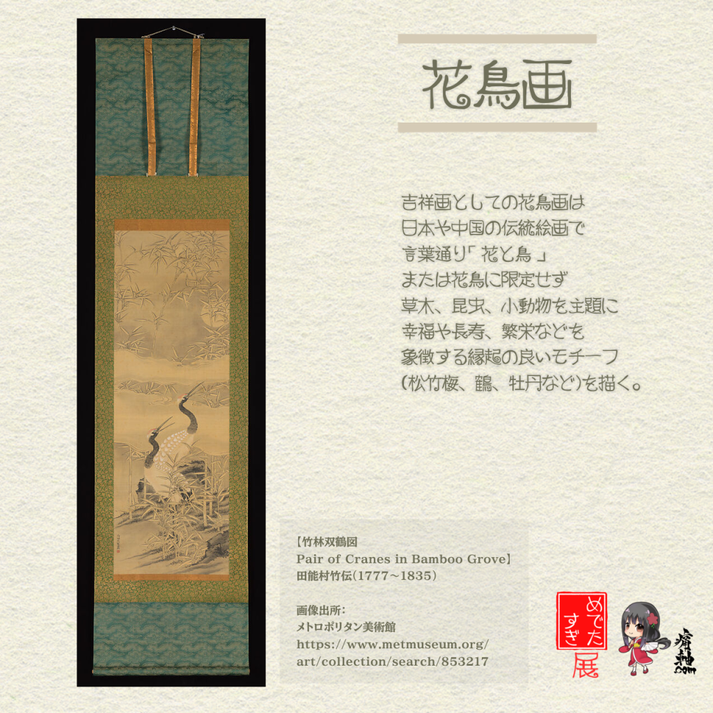 花鳥画(かちょうが) – 花と鳥の調和(例:梅に鶯)。